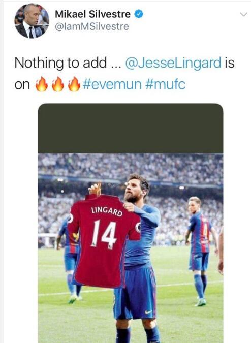 当然,这肯定是一张由曼联支持者P出来的图片,不过西尔维斯特将这样的一张照片发布在社交网络上,这足以证明该名法国名宿对于林加德出色表现的肯定。