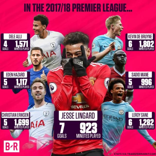 数据显示,本赛季大红大紫的曼城中场核心德布劳内,在英超联赛中出场1802分钟、打入6球,其超过300分钟才能攻入一球的效率,显然无法与林加德相提并论。除了德布劳内之外,德利-阿里(1571分钟/进4球)、阿扎尔(1117分钟/进5球)、埃里克森(1699分钟/进5球)、马内(996分钟/进5球)、萨内(1282分钟/进6球)等一线攻击型前卫、边锋的进球效率,也都明显不及林加德。