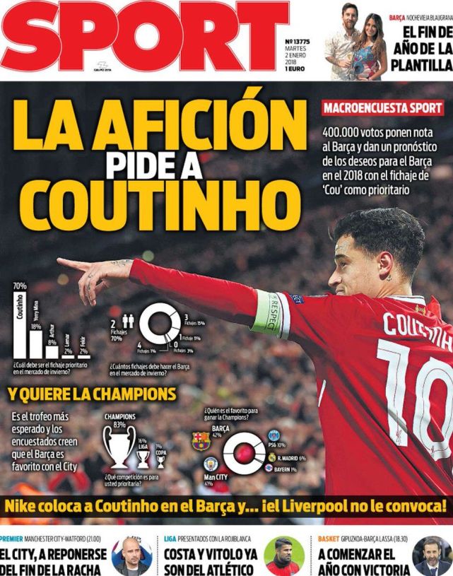 腾讯体育讯 加泰罗尼亚媒体《每日体育报》报道称,西甲豪门巴塞罗那要想让该队死忠感到满意,就必须在冬季转会期间做成两笔交易:其一,从英超豪门利物浦签下巴西国脚中场库蒂尼奥;其二,将队内冗员、土耳其国脚球星阿尔达-图兰赶出诺坎普球场。