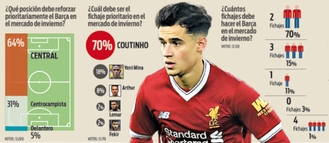 在“巴塞罗那是否需要在冬季转会期间引进新援”的调查中,加泰罗尼亚死忠达成了空前的共识:总共只有3%的球迷在这项调查中投出了反对票;有超过七成的投票者都认为,红蓝军团至少应该在今年1月引进两名高水平球员,而库蒂尼奥则必须是其中之一。除了利物浦前场核心之外,巴西中后卫耶里-米纳(18%支持率)也是巴塞罗那球迷希望在今年1月签下的球员。