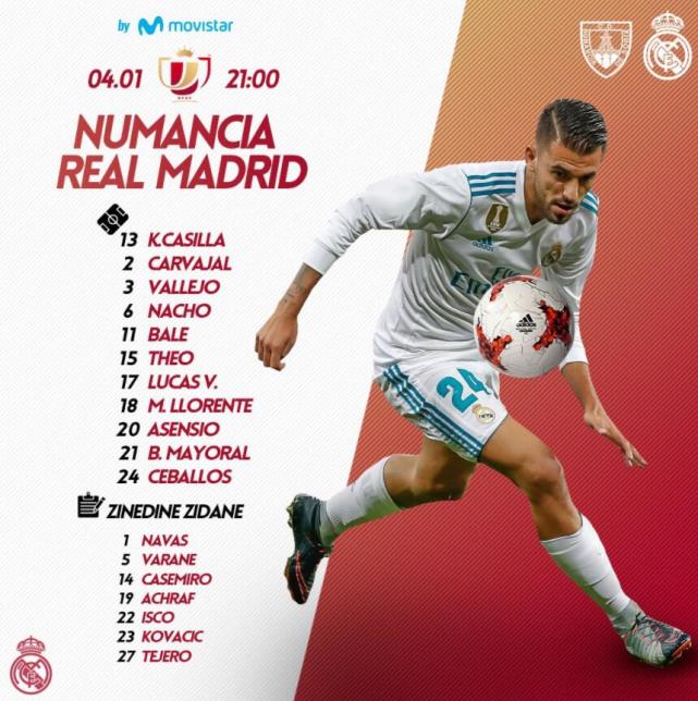 腾讯体育讯 北京时间1月5日凌晨4:00,国王杯1/8决赛首回合中,皇马客场出战西乙球队努曼西亚。皇马首发已公布,贝尔领衔,阿森西奥出战,马约拉尔塞瓦略斯略伦特巴列霍与泰奥-埃尔南德斯等轮换首发,C罗轮休: