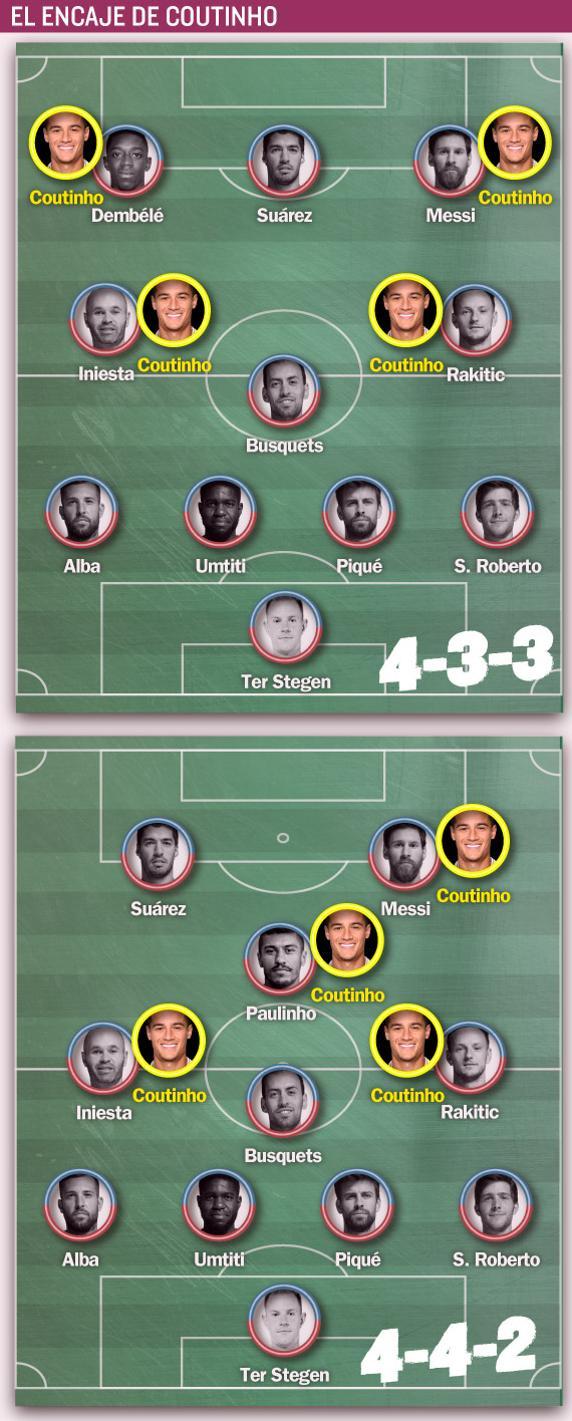《每日体育报》则指出:如果巴萨踢433阵型,在中前场的6个位置中,库蒂尼奥除了中锋和后腰不能踢之外,其余4个位置都可以打,当登贝莱、梅西、伊涅斯塔和拉基蒂奇出现伤停或者需要轮休的情况下,库鸟都可以顶上去。如果踢442,库蒂尼奥则是可以踢右前锋,左右中场和前腰,依然是除了苏亚雷斯和布斯克茨之外,其余中前场球员的位置,库鸟都可以踢。