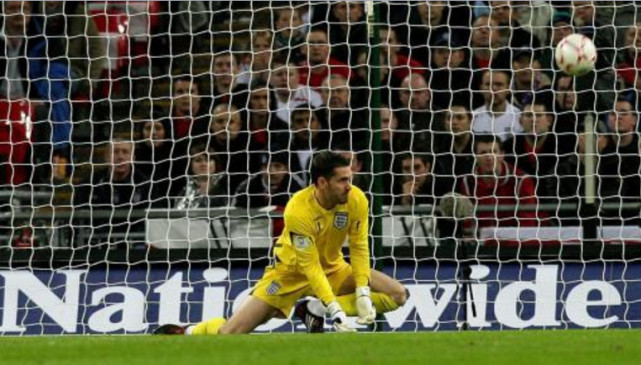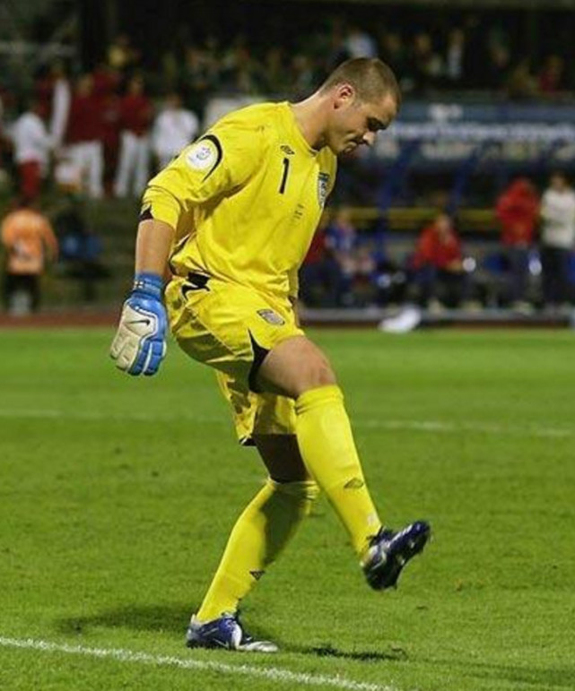 2008欧洲杯预选赛上,英格兰队黄油悲剧演绎到极致。先是加里-内维尔回传,罗宾逊大脚解围竟然一脚踢空,球从他脚边划过滚入大门。英国媒体称这个进球是“胡闹般的进球”。世人惊叹:英格兰的门将不仅仅手上抹油,脚下也会……