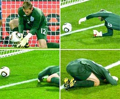 2010年世界杯上,英美大战里,英格兰原本以1-0领先美国队,但此后邓普西一记毫无威胁的远射,竟然被格林莫名其妙的露进大门。一次又一次的因为门将离奇失误而丢球,连英国媒体和英国民众都哭笑不得的说:上帝不喜欢英格兰门将,所以总用最残忍的方式诅咒他们。