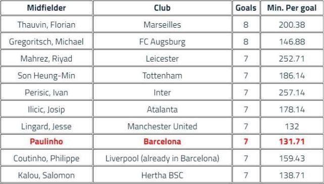 腾讯体育讯 北京时间1月8日,在今天凌晨进行的西甲焦点战上,保利尼奥打入一球,帮助球队击败了莱万特,以4000万欧元的身价加盟巴萨后,保利尼奥的联赛进球数已经来到了7个,在本赛季的五大联赛中场球员进球榜上,他的进球数并列第二,而在前十名里,他的进球效率是最佳的。