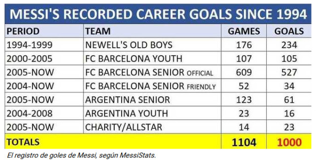 有趣的是,数据统计者指出,梅西还要60个进球没有被统计,分别是他代表当地街区球队格兰多利打入的5球,代表纽维尔老男孩梯队在友谊赛打入的18球,代表巴萨青年队在季前赛打入的24球,在河床试训期间打入的12球等等,不过这些进球都没有被官方记录。当然,没有这些进球,梅西的进球数也来到了1000个。