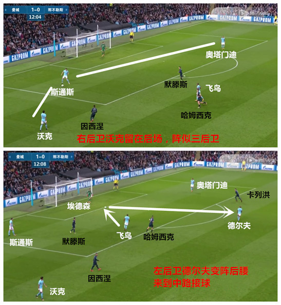 在蓝月的433阵型里,沃克不再像效力热刺时那样频繁沿右边路助攻,而是经常内收保护中路,扮演半个中卫-半个后腰的角色;德尔夫被改造为左后卫,由守转攻时向中路靠拢,和后腰费尔南迪尼奥一起拱卫防线;边路进攻交给边锋完成,但左右各有分工,左翼的萨内靠近边路,右翼的斯特林穿插中路,右路传中交给谁?开启上帝视角的德布劳内。当然,由于阵型和人员组成的不同,索帅无法全盘照搬瓜帅的战术,不过佩普对德尔夫、沃克和斯特林等人的使用,绝对值得他深入学习和借鉴。