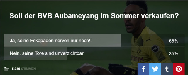 腾讯体育讯 当地时间本周二,《天空体育》德国站进行了一次民意调查,主题为“多特蒙德是否应该在今年夏天出售奥巴梅扬?”从目前的民调结果来看,大多数人都认为多特蒙德应该卖掉这位加蓬国脚前锋。