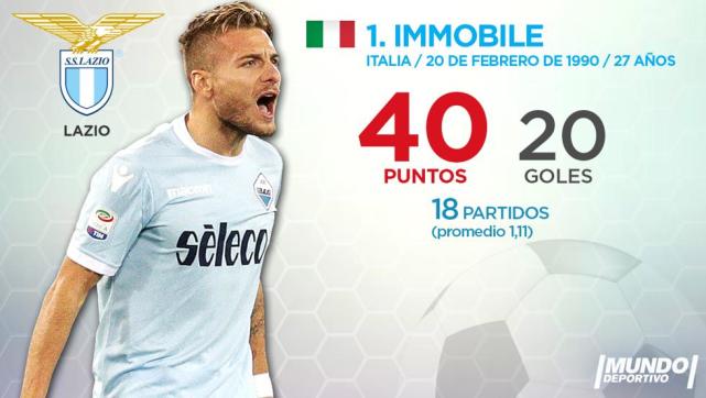 在加盟拉齐奥后,因莫比莱开始复苏,他在本赛季的意甲发挥尤为出色,上轮上演大四喜后,他在本赛季的数据是18场20球,暂时拿到了40个积分,在欧洲金靴奖的争夺战上,意大利射手处于领跑位置。
