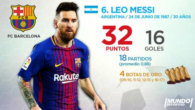 梅西目前排名第6位,他在18场西甲打入了16球,场均可以打入0.88球,积分是32分,不过即便是这样出色的数据,梅西也只能排名五大射手之后。