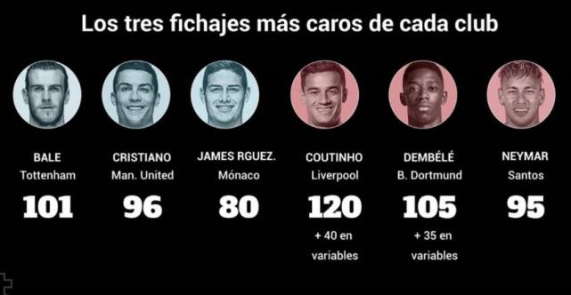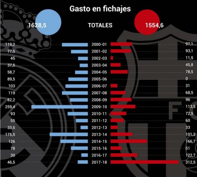 在库蒂尼奥和奥斯曼-登贝莱身上,巴萨的花费都超过了1亿欧元,而他们在本赛季的引援开支要远超皇马。这又重启了两支西班牙豪门谁更能花钱的讨论,《阿斯报》用一张图表的方式对两强的开支进行了形象的说明。