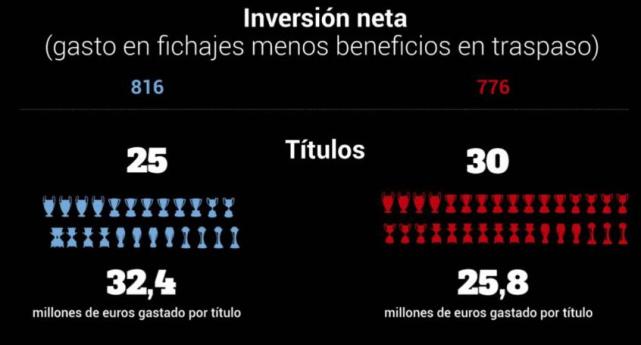 综合算下来,在净投入上,皇马是8.16亿欧元,而巴萨是7.76亿欧元,巴萨平均赢得每个冠军的成本的是2580万欧元,而皇马是3240万欧元。
