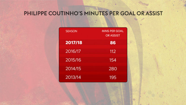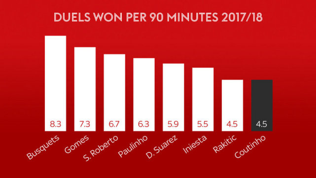 数据显示,库蒂尼奥每90分钟仅有4.5次成功对抗,在巴萨中场球员中排名倒数第一位,与拉基蒂奇持平。在赛季后半程,巴萨会给库蒂尼奥足够的出场时间来帮助他提升。如果格列兹曼夏窗加盟巴萨,那么库蒂尼奥会继续踢中场。而在进攻方面,库蒂尼奥本赛季的表现极为出色。赛季至今14场英超,库蒂尼奥打入7球并有6次助攻,平均每86分钟打入1球,这是他效率最高的1个赛季。