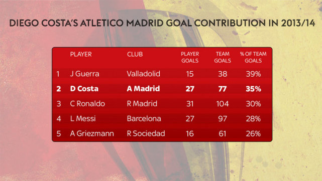 对马竞来说,他们面对的最大问题是迭戈-科斯塔会发挥多大的作用。在2013-14赛季,科斯塔共打入了27球,而马竞一共只打入了77球,这比C罗在皇马、梅西在巴萨的比率更高,马竞希望科斯塔恢复这样的效率。赛季至今,马竞的其他前锋射门效率都不高,他们的进球数都没有超过5球。