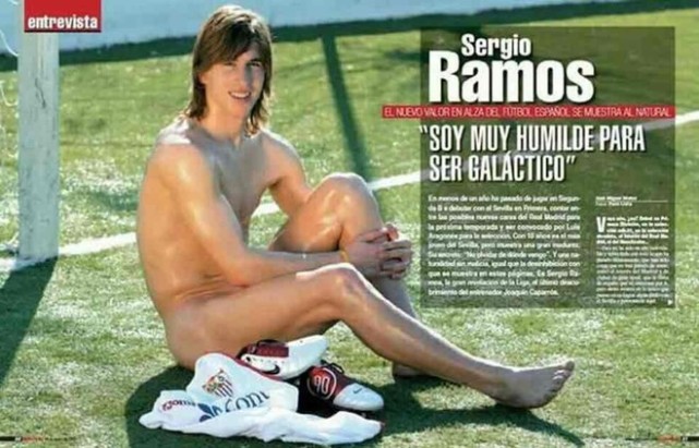 拉莫斯这组大尺度照片是接受《行动者》杂志采访时拍摄的,皇马队长或坐或站,一丝不挂。在其中一张照片中,拉莫斯把鞋带挂在脖子上,鞋带两头系着的两只球鞋绕过他脖子,垂放在他身体前,球鞋刚刚好地遮挡住男人的关键位置。
