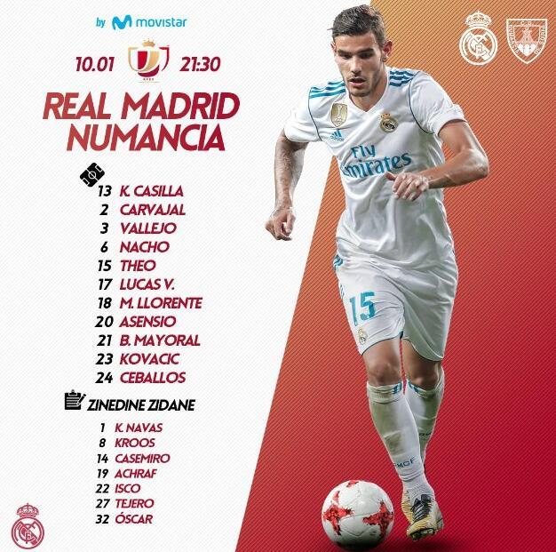 腾讯体育讯 北京时间1月11日凌晨4:30,国王杯1/8决赛次回合中,皇马主场出战努曼西亚。皇马首发已公布,阿森西奥卡瓦哈尔领衔,马约拉尔出任中锋,科瓦契奇坐镇中场: