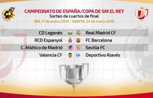 第一对被抽出的对阵是莱加内斯和皇马,第二对对手是西班牙人和巴萨,第三对对手是马竞和塞维利亚,第四对对手瓦伦西亚和阿拉维斯则是自动产生。
