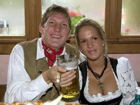 还是拜仁新人时,小猪就酷爱豪饮,图为小猪和莎拉前任在一起欢度慕尼黑啤酒节