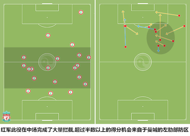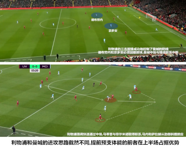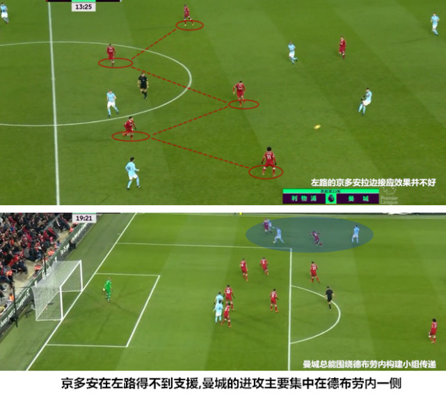 红军如人们预期的那样在开场阶段就开始尝试高位逼抢,但他们的目标并不是直接从曼城卫线球员脚下截获皮球,而是通过合理的站位阻塞曼城后场球员的推进和传球路线,迫使客队的中场双核德布劳内和京多安回撤接球,在两人背身接球的瞬间实施围抢。利物浦的两名进攻型中场和三名前锋,实际上是限制了曼城方面除门将以外的7名中后场球员。
