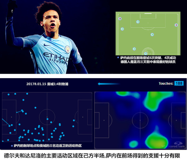 由于难以舒服地完成回撤接球,德布劳内选择远离费尔南迪尼奥而游弋于利物浦中场和卫线之间的地带,中锋阿圭罗开始来到左肋部区域做墙中转。在大卫-席尔瓦缺阵的情况下,阿圭罗作为队内前场持球稳定性最好的球员需要扮演临时前腰的角色,瓜迪奥拉将其作为“中场”来辅助进攻推进,此举既解放了德布劳内,也规避了阿根廷人在绝对速度和爆发力方面的劣势。上半场中段,曼城在德布劳内的带领下连续制造攻势,幕后英雄阿圭罗功不可没。