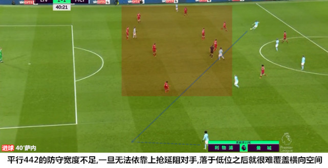 在德布劳内连续依靠斜传和直塞推动进攻的阶段,利物浦开始有意识地向己方半场收缩来为下一阶段的持续压迫储备能量。然而,红军的442/451防守体系很快就在低位防守中暴露出了宽度不足的问题,曼城的外围持球人可以从容地利用场地宽度发动进攻。萨内扳平比分的进球从表面上看是戈麦斯和卡里乌斯的失误,深究而论则是狭窄的防守阵型在压迫强度下降后遭受持续攻击时的必然结果。