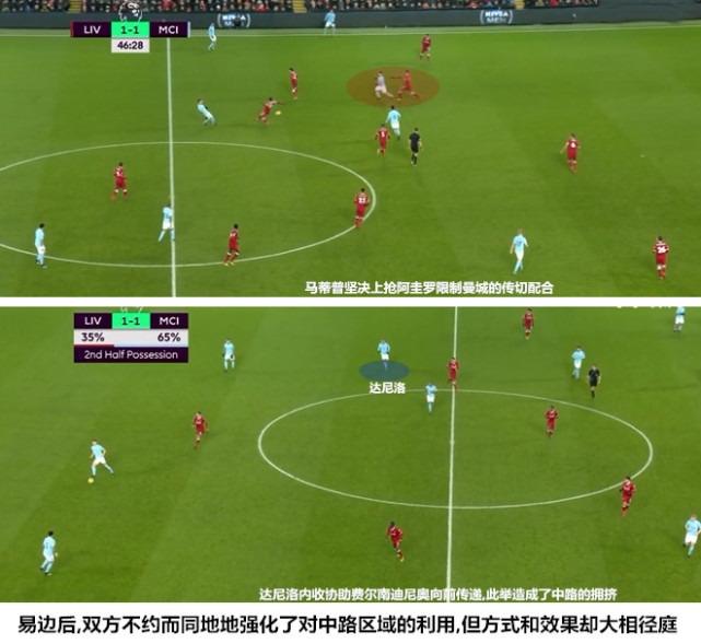 易边之后,体能得到恢复的红军再度倾巢出动实施前场压迫,他们在这次短促突击中取得了辉煌战果,菲尔米诺、马内和萨拉赫的进球几乎提前杀死了比赛。曼城在这一阶段全面失势的最重要原因就是右脚打左闸的达尼洛不适应“边后腰”角色,巴西人在中场持球时无法与身前的京多安和萨内形成联系。曼城在两翼通道关闭后只能从人员密集的中路区域尝试向前传递,克洛普指挥马内和萨拉赫适时内收配合三中场围剿费尔南迪尼奥,彻底切断了曼城的中场运输线。
