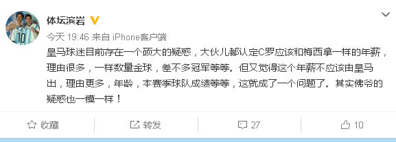 西甲专家滨岩在微博上对此进行了分析,他写道,“皇马球迷目前存在一个硕大的疑惑,大伙儿都认定C罗应该和梅西拿一样的年薪,理由很多,一样数量金球,差不多冠军等等。但又觉得这个年薪不应该由皇马出,理由更多,年龄,本赛季球队成绩等等,这就成了一个问题了。其实佛爷的疑惑也一模一样! ”
