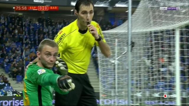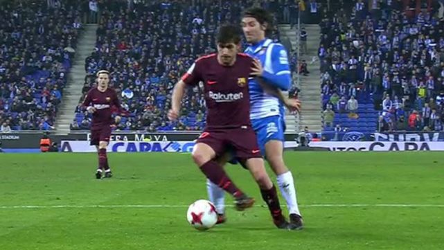 9分钟之后,塞尔吉-罗伯托禁区右肋得球,却被身后的格拉内罗撞倒,德布尔戈斯这一次判罚了点球,西班牙人球员集体抗议,但主裁判坚持自己的判罚。慢镜头显示,格拉内罗逼抢时左脚踩踏了巴萨右闸的小腿和左脚,这次判罚并无争议,前西甲裁判奥利弗指出,“裁判的判罚是正确的,因为格拉内罗很显然踩到了罗伯托。”让主场球迷为之兴奋的是,迭戈-洛佩斯封出了梅西主罚的点球。