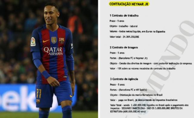 首先就是巴萨在内马尔工资上的巨额花费,根据合同,巴萨5年里支付给内马尔的薪水达到了7100万欧元,因为合同规定内马尔的税后年薪不得低于3500万欧元,除去税收部分,巴萨的实际支出是内马尔薪水的两倍。除了薪水,巴萨还和内马尔签订了肖像权出让合同,此外还有一份与经纪公司签订的合同,这份合同的费用达到了249万欧元。