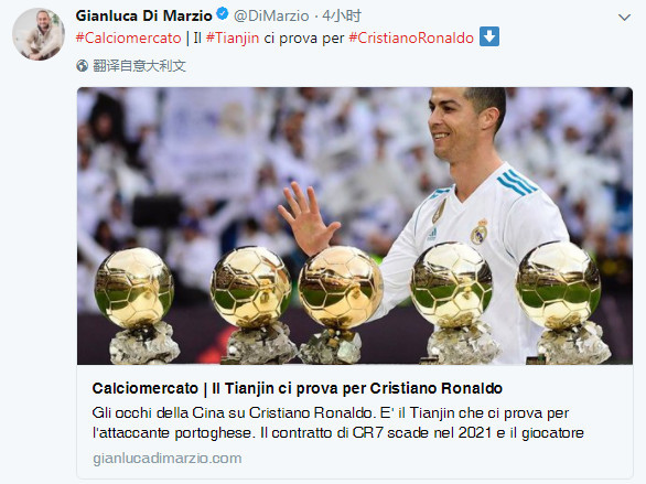不过意大利的转会专家迪马济奥透露,目前有天津的球队对C罗有兴趣,而这样的话,这两支球队不是天津权健就是天津亿利。在文章里,迪马济奥没有透露更多的信息,可见,这则消息还有待确认。
