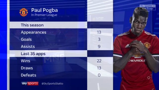 根据天空体育的统计,在过去35场他出场的英超比赛,曼联都保持不败,球队的战绩是22胜13平。博格巴出场,曼联往往就能保持不败,而曼联赛季首败不敌哈德斯菲尔德的比赛,博格巴没有出场,在曼联客场0-1不敌切尔西的比赛里,他因伤没有出场。随后在老特拉福德对阵曼城的比赛里,博格巴因为停赛没有出场,曼联输掉了比赛。或许,这三场球,如果博格巴可以出场的话,曼联的结果会大不同。