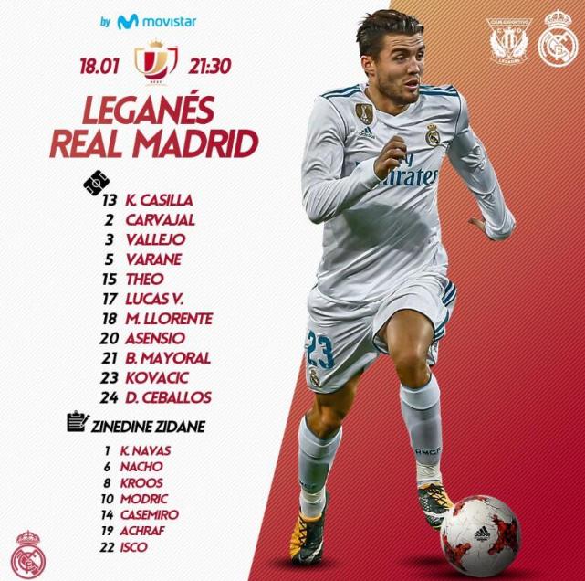 腾讯体育讯 北京时间1月19日凌晨4:30,国王杯1/4决赛首回合中,皇马客场出战莱加内斯。皇马首发已公布,卢卡斯-巴斯克斯与阿森西奥领衔攻击线,瓦拉内卡瓦哈尔镇守后场,莫德里奇伊斯科担任替补,本泽马拉莫斯因伤缺席,C罗轮休: