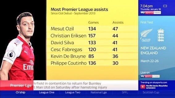 厄齐尔在2013年夏天加盟阿森纳,转会费是4250万英镑,虽然德国人也经常受到诟病,但是他在英超的发挥还是不错。天空体育指出,自从2013年9月份以来,厄齐尔在英超赛场一共出场了134次,助攻了47次,在同期所有球员里,他送出的助攻数是最高的。排名第二的是热刺的埃里克森,丹麦人在157场比赛送出了44次助攻。
