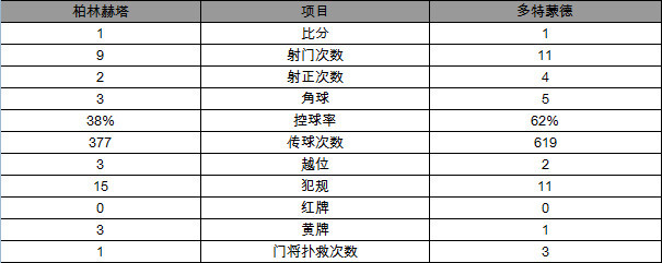 全场比赛,多特蒙德11次攻门4次射正,柏林赫塔9次攻门2次射正,双方各入1球。多特蒙德控球率达到62%,柏林赫塔只有38%。