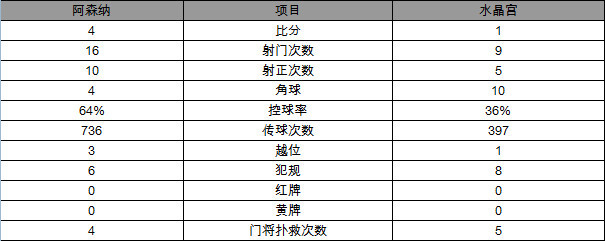 全场比赛,阿森纳15次攻门10次射正打入4球,水晶宫9次攻门5次射正打入1球。阿森纳控球率达到64%,水晶宫只有36%。