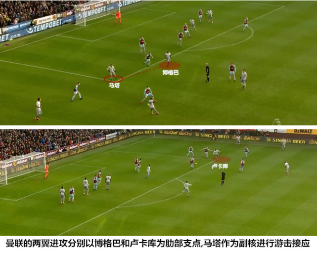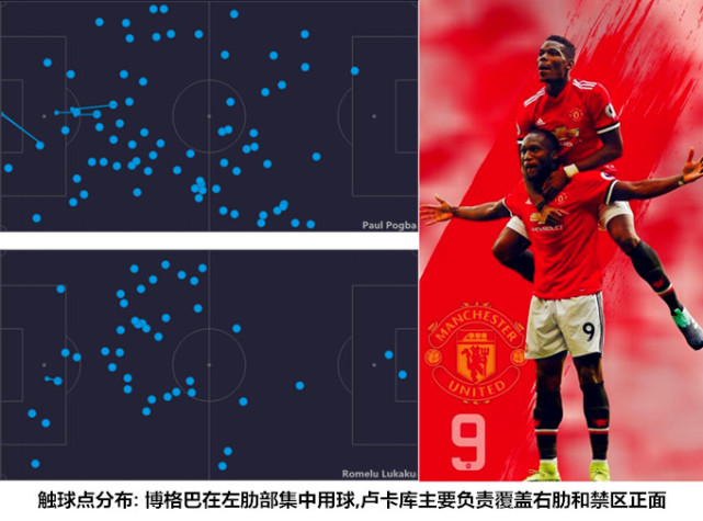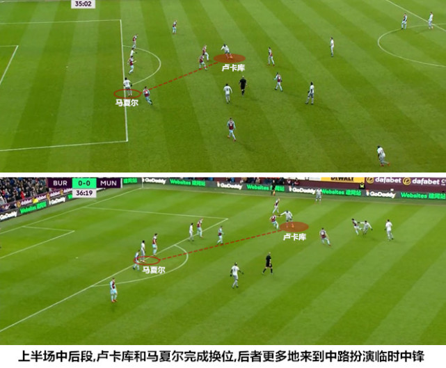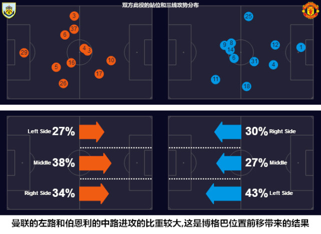 在博格巴主导左路攻势的同时,中锋卢卡库频繁回撤到右路接球来平衡两翼的攻势,具备一定抢点能力的马夏尔和博格巴顺势切入禁区填补中锋位置的空缺。卢卡库在肋部持球时既能选择直接斜传禁区寻找“双中锋”,也可以通过横向大范围转移调动伯恩利的防线,处于弱侧的阿什利-杨在接球后进行二次组织。