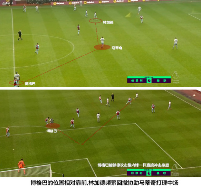 鉴于林加德在人员密集区的作用并不明显,穆里尼奥将他改造成了一名前后覆盖、不断追逐皮球的B2B中场。博格巴长时间滞留前场,身材高大但脚下速率稍逊的马蒂奇无法完成整个横向空间的扫荡,穆里尼奥安排菲尔-琼斯和林加德来填补腰位的漏洞,前者需要在阿什利-巴恩斯接球的瞬间完成上抢干扰,后者则要密切注意德福尔和杰克-科克的前插路径。