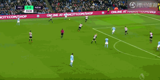 上半场比赛第34分钟,德布劳内左侧持球,面对防守球员的包夹他直接弧线球传中将球送到禁区。此时,球队中锋阿圭罗在禁区内面对纽卡三名中锋的盯防,但德布劳内的弧线球直接绕开了对手的前点中卫并直接转向防线身后,积极前插的阿圭罗甩开对手的第二名中卫门前将球蹭入球门远角得分!