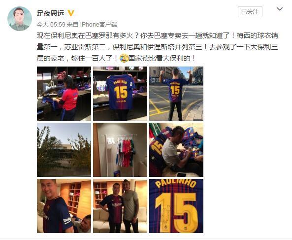 名记:保利尼奥球衣销量巴萨第3 豪宅能住一百人