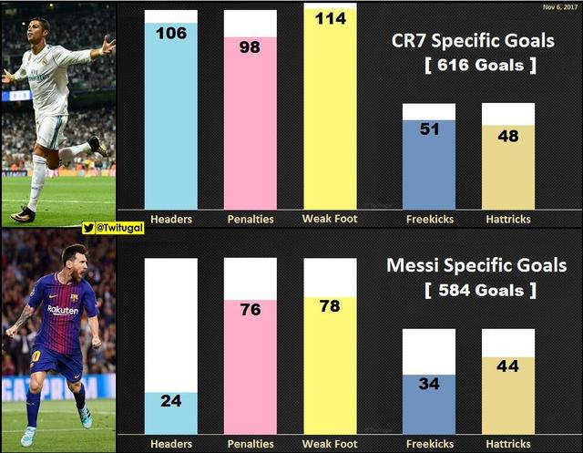 全能战神!C罗5项进球数据碾压梅西 头球多82个
