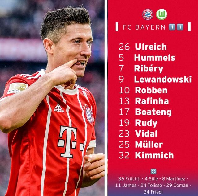 拜仁VS狼堡首发:莱万突前 罗贝里出击