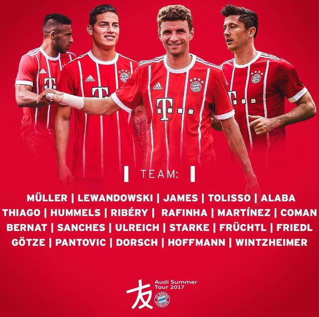 拜仁中国行名单:J罗领衔 罗本博阿滕因伤缺席