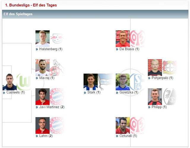 德甲次轮最佳阵容:拉姆哈马斯 27分钟戴帽神人