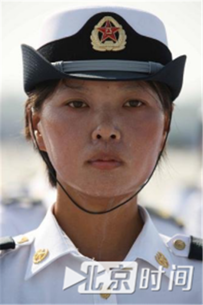在2009年的一张照片里,站军姿的女兵由于天气炎热大量出汗,汗水冲掉了涂抹的防晒霜,在脸上留下了一道道痕迹。